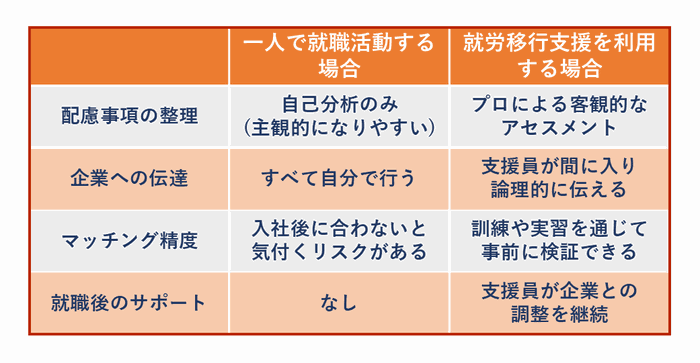 最大の違いは、客観性と仲介役の有無です。専門家が間に入ることで、企業側も「この配慮があれば、この人はこれだけの成果を出せるんだ」と安心して受け入れを検討できるようになります。